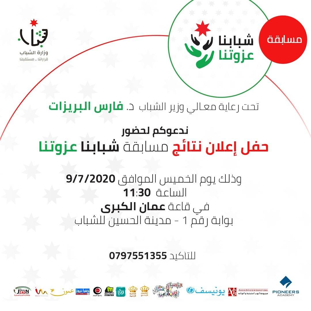 اعلنت مسابقة شبابنا عزوتنا ، عن موعد إعلان نتائج المسابقة ، وذلك بأنه تم تحديده، يوم الخميس، الموافق ٢٠٢٠/٧/٩ ، في تمام الساعة ١١:٣٠ ،في قاعة عمان الكبرى .