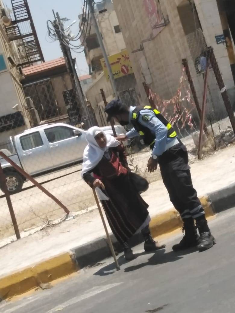 قام رجل أمن عام ، بمساعدة امراة تكبر عمراً ، في قطع الطريق ، حتى تصل إلى بر الأمان .