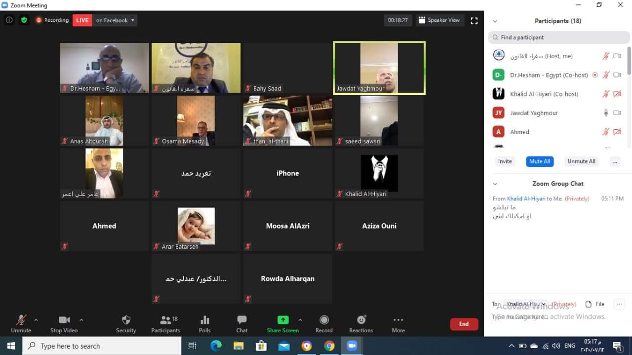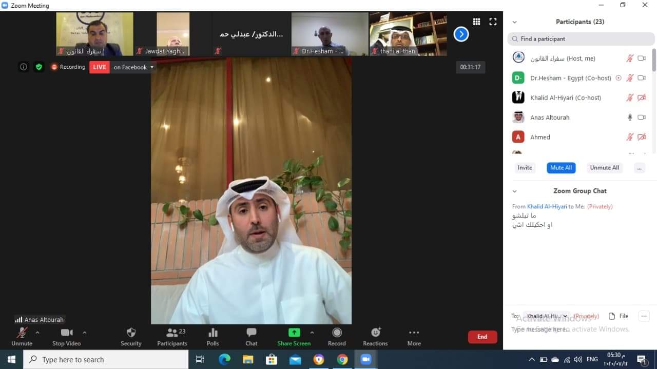 عقدت مبادرة سفراء القانون ممثلة برئيسها الاستاذ احمد القطيشات محاضرة بعنوان أثر أزمة كورونا على التحكيم الدولي وذلك في يوم الأحد الموافق 12/7/202‪0  بنظر الدعاوى التحكيمية عن بعد باستخدام الوسائل الحديثة - في ظل أزمة كورونا الحالية، وفي إطار تطبيق إجراءات التباعد الاجتماعي التي تتخذها دول العالم، ما يعزز من قدرة تطبيق التحكيم عن بعد بشكل أوسع، لتطبيق التحكيم الدولي لتسوية المنازعات بين الدول عن بعد  وضمان سير العملية التحكيمية بنجاح، باعتبار أن  التحكيم أحد فروع القانون والتي تتسم بطابع دولي في أنه يجمع العديد من الاشخاص من كافة الدول, لذلك يعتبر التحكيم  من المجالات التي تتأثر بفيروس كورونا  لذا اتجه العديد من رجال القانون للنظر للفيروس من الناحية القانونية ودراسة الآثار القانونية التي سوف يخلفها في مجال التجارة الدولية مع الأخذ بعين الاعتبار التأثيرات المباشرة على سير إجراءات التحكيم الدولي