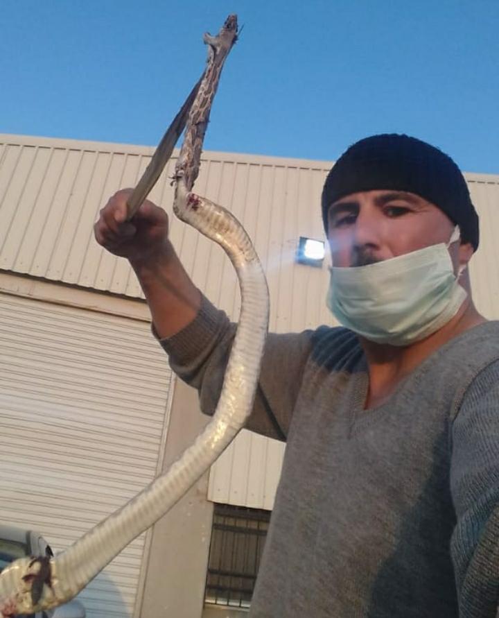 اقدم أحد الموظفين، ممن يعملون ، بالمنطقة التنموية، في محافظة المفرق ، على قتل افعى ، يبلغ طولها حوالي مترين ، في أحد المصانع .