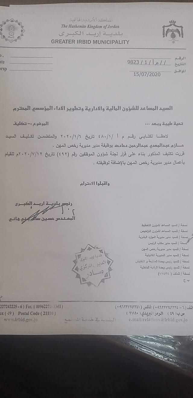 كلف رئيس بلدية اربد الكبرى ،المهندس حسين بني هاني ، اليوم الأربعاء ، السيد حازم عبد المهدي عبد الرحمن دحادحه ،القيام بوظيفة مدير مديرية رخص المهن .
