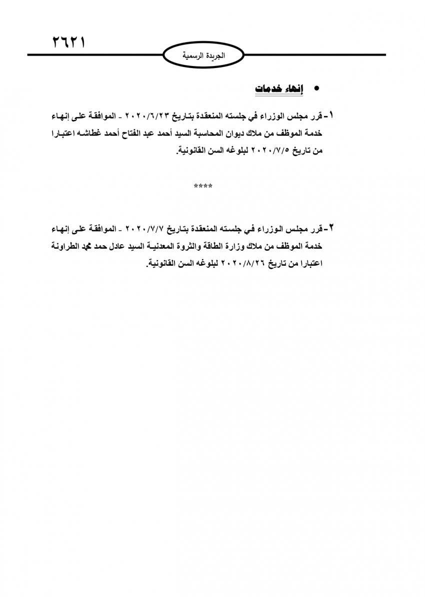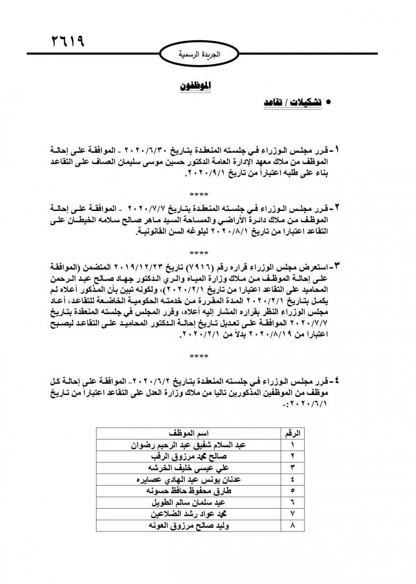 صدر في عدد الجريدة الرسمية اليوم الخميس قرارات مجلس الوزراء باحالة عدد من موظفي الدولة الى التقاعد.