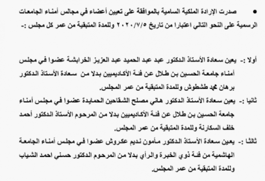 صدر في عدد الجريدة الرسمية اليوم الخميس الارادة الملكية السامية بالموافقة على تعيين 3 اعضاء جدد في مجلسي امناء جامعتي الحسين بن طلال والهاشمية.