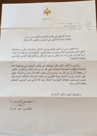 وأشار رئيس الوزراء في كتاب الشكر إلى وقوف العاملين في قطاع المناجم والتعدين إلى جانب الوطن وتغليب المصلحة الوطنية داعيا الله عز وجل أن يحفظ الأردن من كل شر وسوء .
