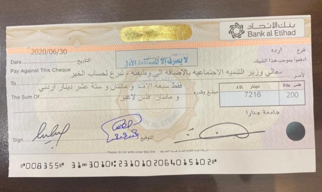 ايمانًا بدورها المجتمعي والإنساني، وتجسيدًا لرسالتها ورؤيتها وأهدافها في مد جسور التعاون مع مختلف مؤسسات الدولة الحكومية والخاصة، قامت جامعة جدارا ممثلة برئيس هيئة المديرين المدير العام الدكتور شكري المراشدة، ورئيس الجامعة الأستاذ الدكتور محمد طالب عبيدات بتقديم مبلغ ٧٢٠٠ دينار لحساب الخير لصالح وزارة التنمية الاجتماعية تسلمه نيابة عن وزيرة التنمية الاجتماعية مدير التنمية الاجتماعية للواء بني عبيد السيد ناصر الشريدة.