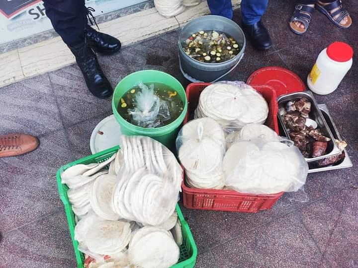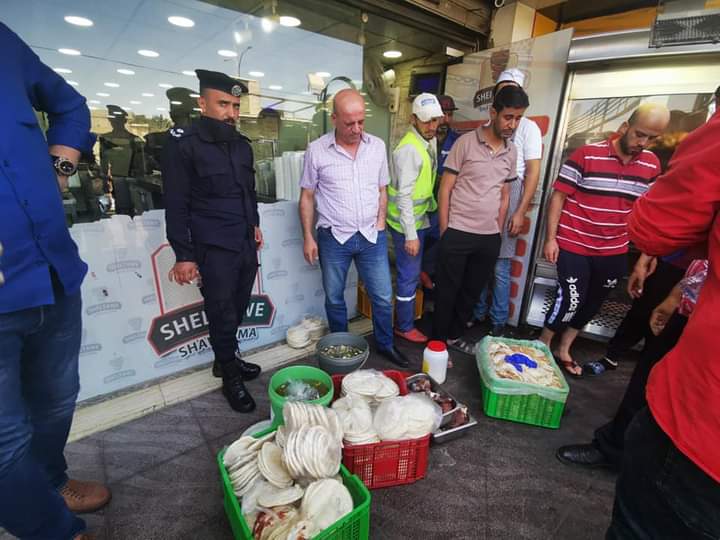 كما تم ضبط أحد مطاعم الشاورما وهو بحالة سيئة لوجود لحوم ودجاج تالف ووجود ريش دجاج على أسياخ الشاورما...كما أن شروط السلامة العامة والنظافة سيئة ...