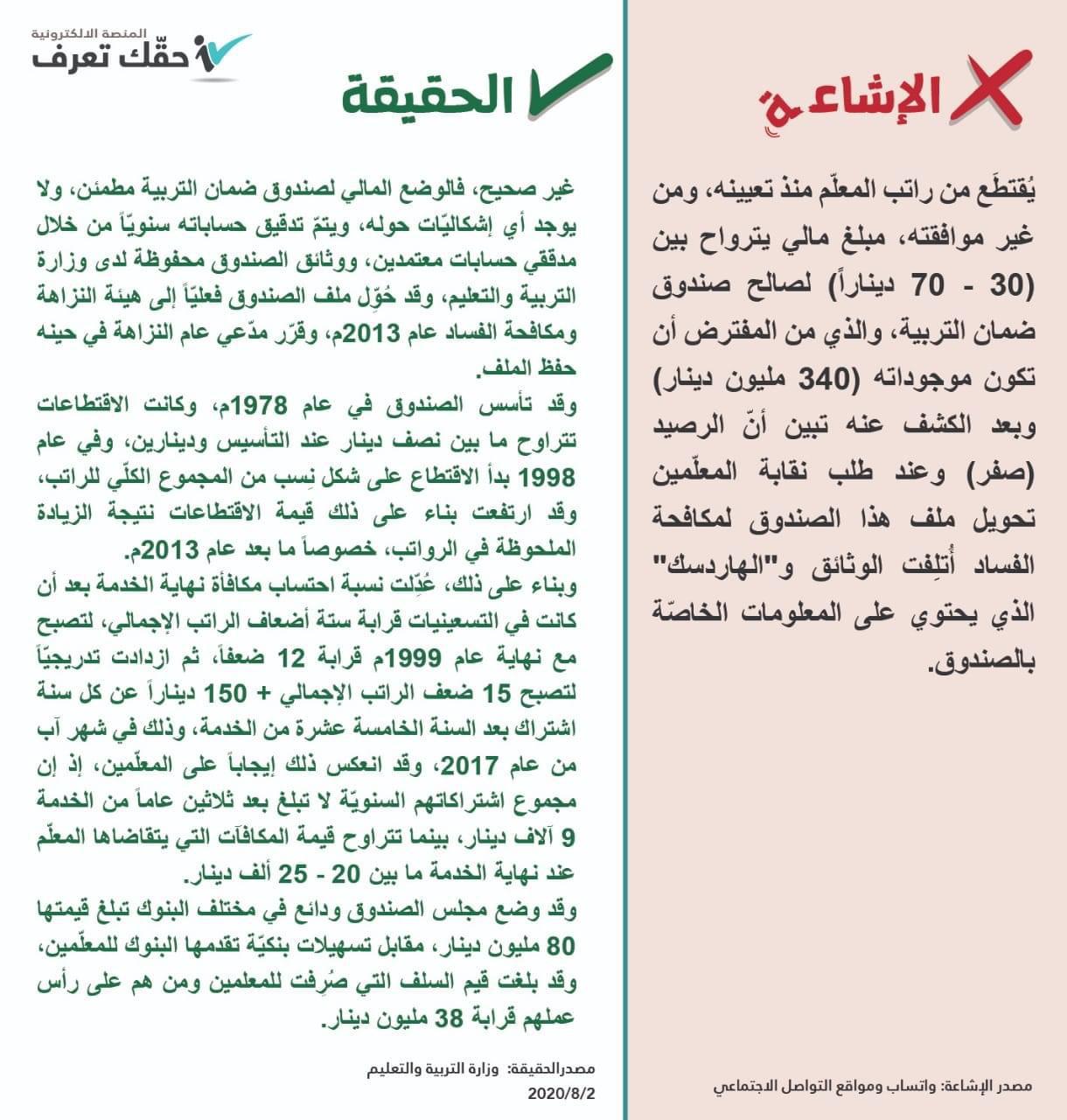 و أكدت  بأن ما يشاع  حول ،بأنه يتم اقتطاع من راتب المعلم ، منذ تعيينه ، ومن غير موافقته  مبلغ مالي يتراوح بين 30  إلى 70ديناراً، لصالح صندوق ضمان التربية ، والذي من المفترض أن تكون موجوداته 340 مليون دينار ، غير صحيح ، وانما هي شائعة .