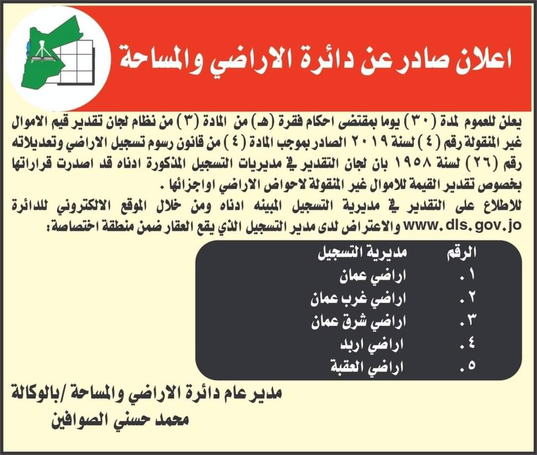 اعلان صادر عن دائرة الأراضي والمساحة