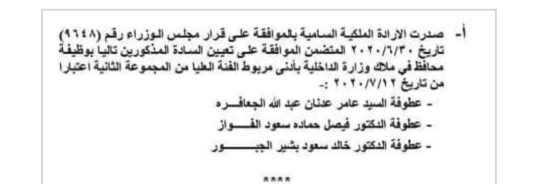 إرادة ملكية بترفيعات محافظين في وزارة الداخلية... "أسماء "