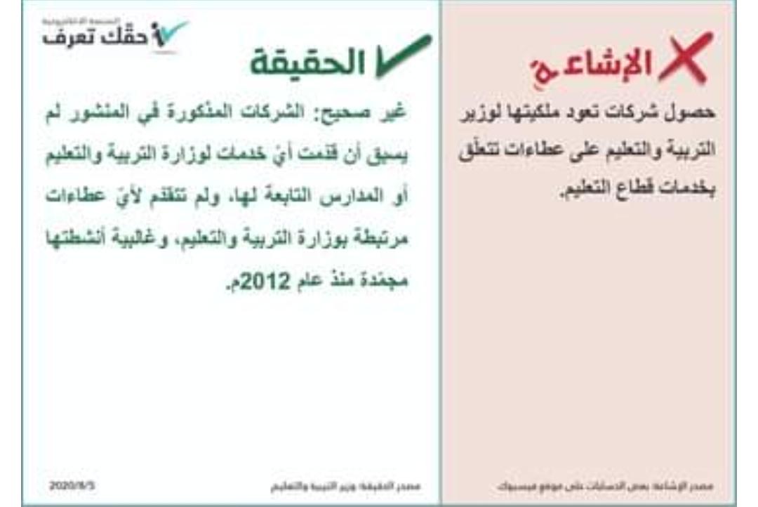 وأشار النعيمي ، من خلال ، توضيح أصدره عبر منصة حقك تعرف ، بأن الشركات المذكورة ، من قبل الآخرين ، في منشور ، لم يسبق أن قدمت اي خدمات لوزارة التربية والتعليم ، أو المدارس التابعة لها ، ولم تتقدم لأي عطاءات مرتبطة بوزارة التربية والتعليم ، منوهاً إلى أن غالبية أنشطتها مجمدة منذ عام 2012 م .