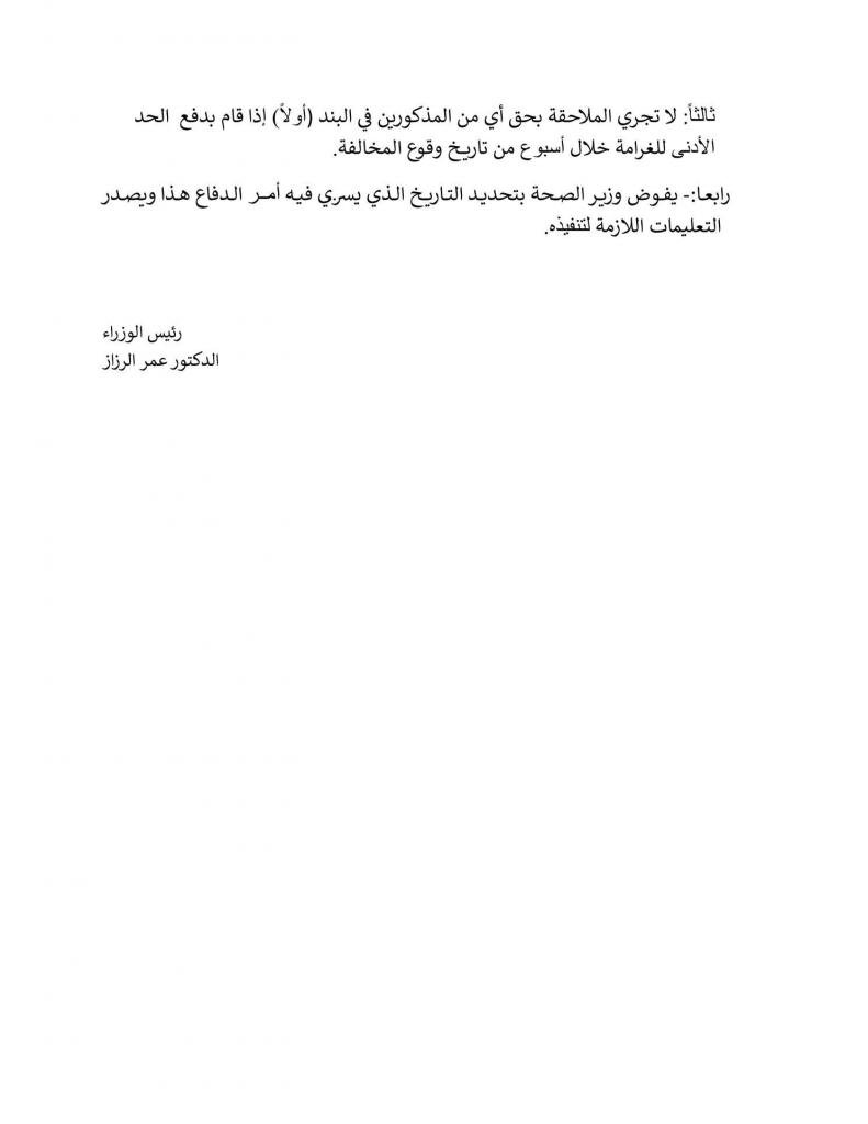 ثالثاً: لا تجري الملاحقة بحق أي من المذكورين في البند (أولاً) اذا قام بدفع الحد الادنى للغرامة خلال اسبوع من تاريخ وقوع المخالفة.