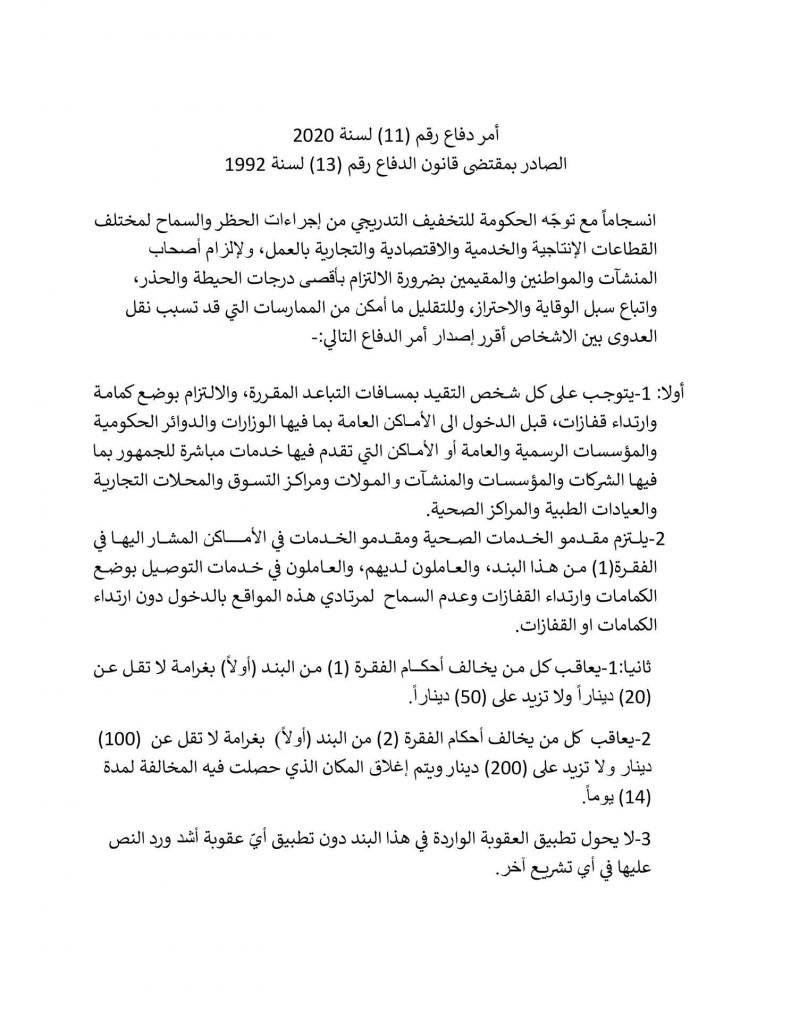 1- يتوجب على كل شخص التقيّد بمسافات التباعد المقررة، والالتزام بوضع كمامة، وارتداء قفازات قبل الدخول إلى الأماكن العامة، بما فيها الوزارات والدوائر الحكومية والمؤسّسات الرسمية والعامة، وقبل دخول الأماكن التي تُقدم فيها خدمات مباشرة للجمهور؛ بما فيها الشركات والمؤسّسات والمنشآت أو أماكن التسوّق والمولات، والمحلّات التجاريّة، والعيادات الطبيّة والمراكز الصحيّة.