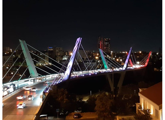 واظهرت صور وثقتها امانة عمان جسر عبدون وهو يضيئ بالوان العلم اللبناني .