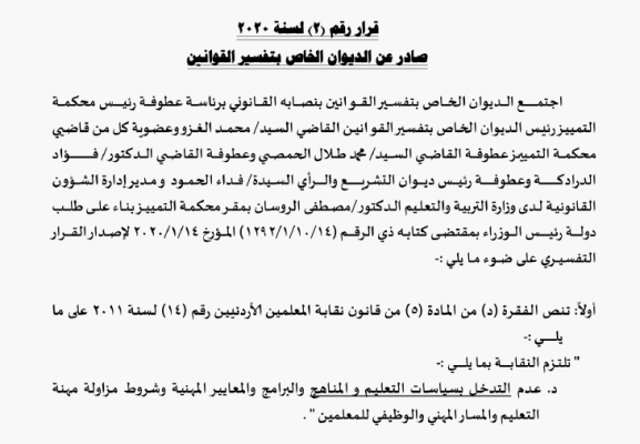 اجتمع الديوان الخاص بتفسير القوانين، بناء على طلب رئيس الوزراء، عمر الرزاز، لاصدار قرار تفسيري بشأن نقابة المعلمين.