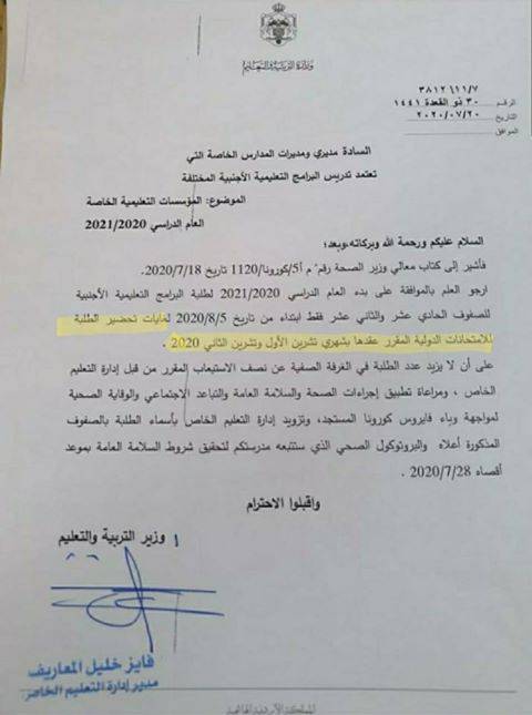 ووجه وزير التربية والتعليم كتابا الى مديري ومديرات المدارس الخاصة التي تعتمد تدريس البرامج التعليمية الاجنبية المختلفة ، اعلمهم فيه بالموافقة على بدء العام الدراسي 2020/2021 لطلبة البرامج التعليمية الاجنبية للصفوف الحادي عشر والثاني عشر فقط ابتداء من تاريخ 2020/8/5 لغايات تحضير الطلبة للامتحانات الدولية المقرر عقدها بشهري تشرين الاول وتشرين الثاني 2020 .