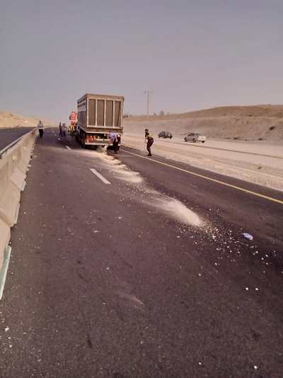 وأضافت في منشور لها عبر حسابها على موقع فيسبوك، إنها توجه "عناية السائقين مرتادي الطريق الصحراوي أنه تم إغلاق حركة السير داخل تحويلة ضبعه باتجاه الجنوب، نتيجة حادث تصادم بين تريلات عدد 2، مما أدى إلى انسكاب الزيوت، دون وجود إصابات".