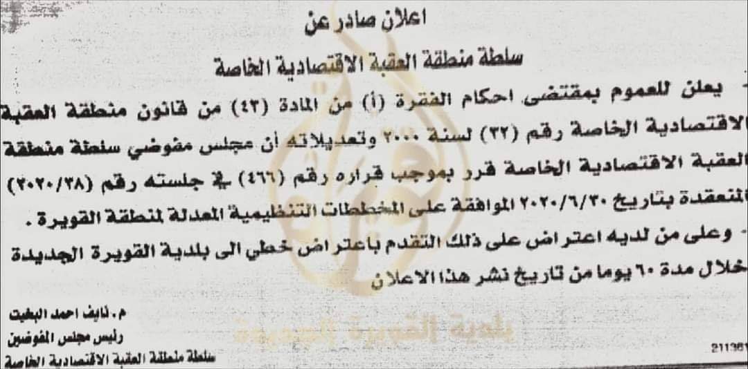 اعلان هام صادر عن منطقة العقبة الاقتصادية الخاصة