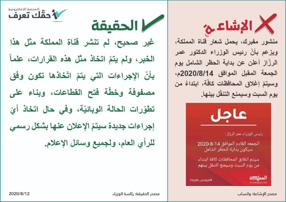 نفت منصة حقك تعرف صحة منشور مفبرك يحمل شعار قناة "المملكة" يزعم بأن رئيس الوزراء الدكتور عمر الرزاز أعلن عن حظر شامل يبدأ يوم الجمعة يعقبه إغلاق تام لكافة المحافظات.