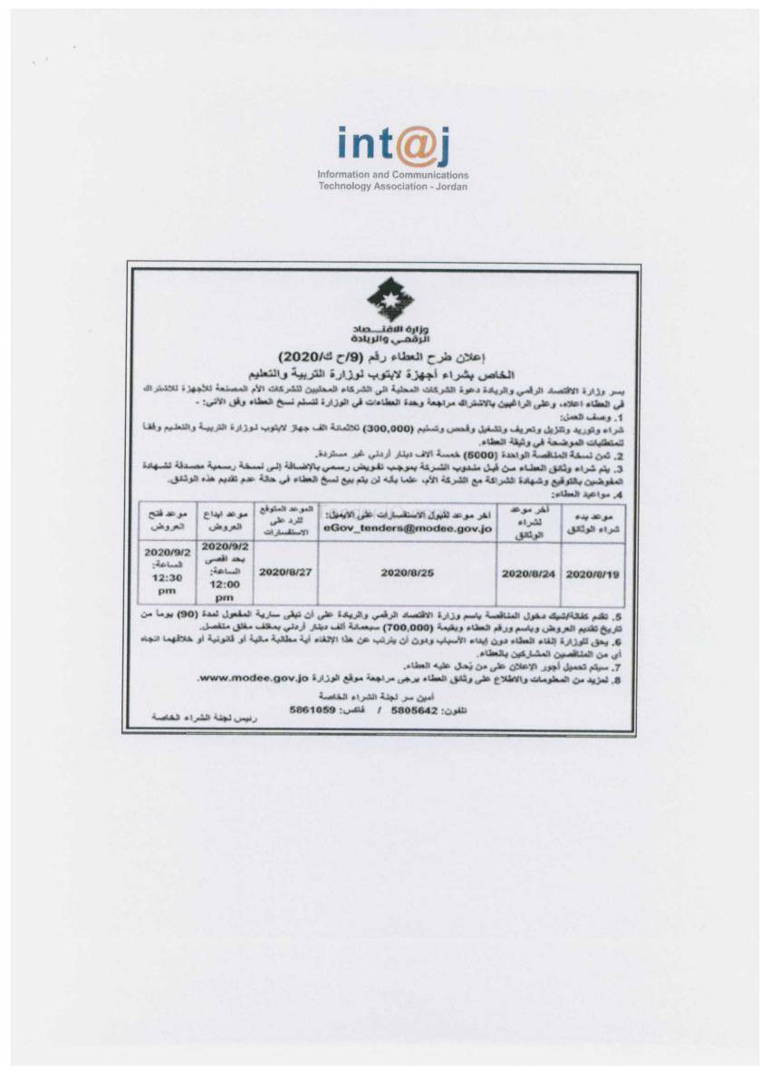 احتج رجل الأعمال المختص بالتكنولوجيا طلال ابو غزالة على اعتراض جمعية شركات تقنية المعلومات والاتصالات "إنتاج" على عطاء شراء 300 ألف لاب توب لصالح وزارة التربية والتعليم، والذي طرحته أمس الاثنين وزارة الاقتصاد الرقمي.