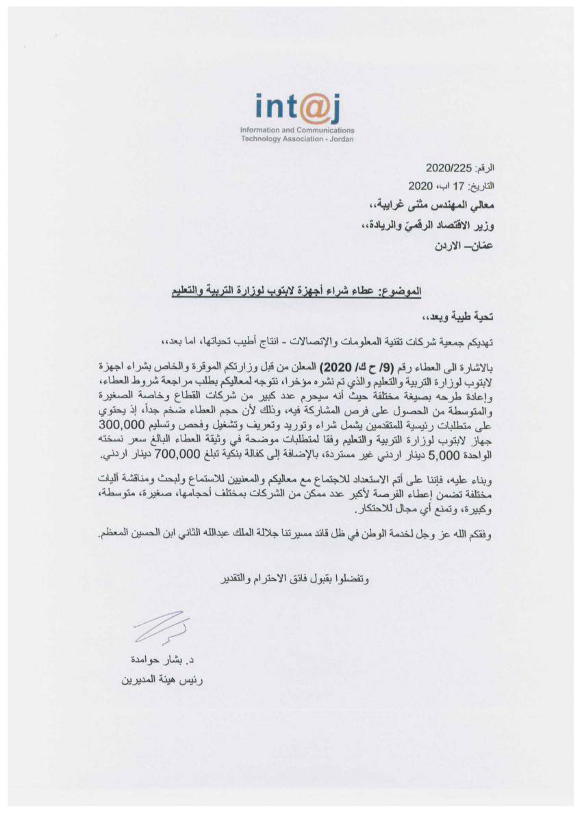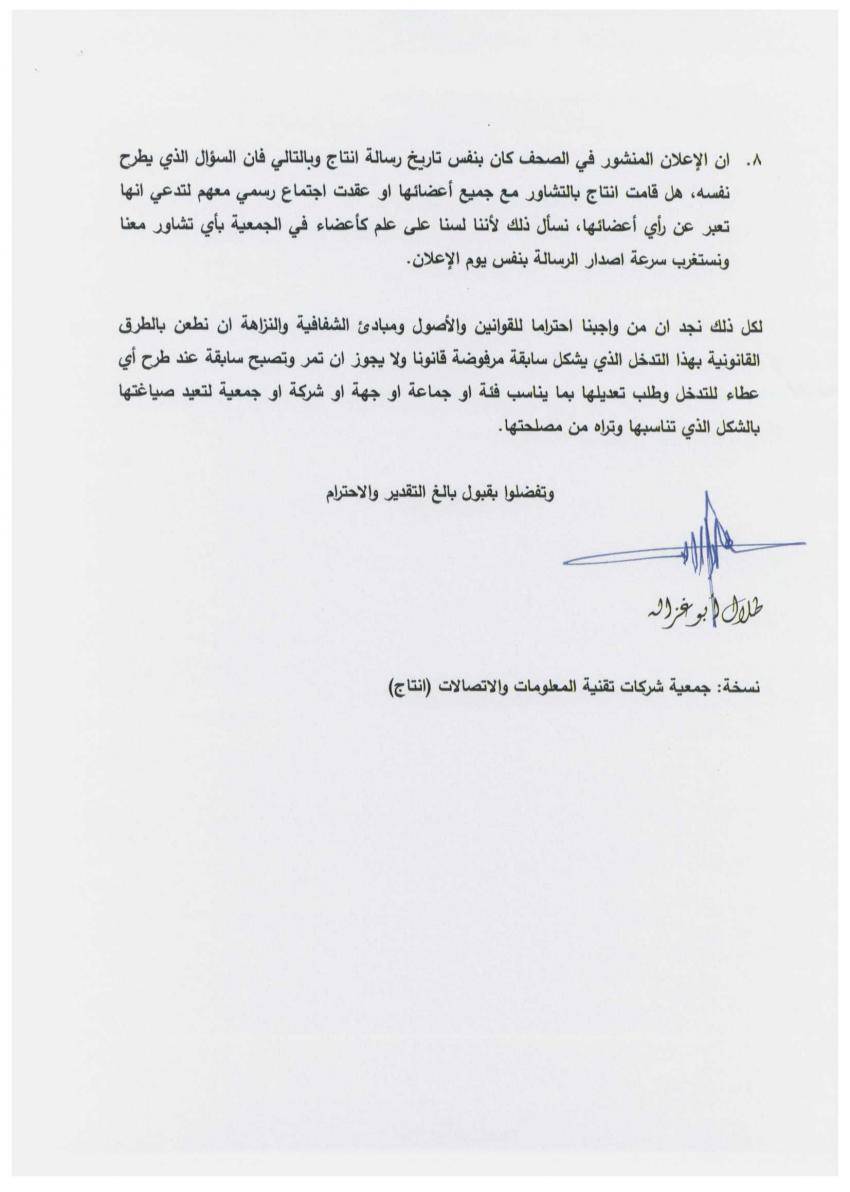 وطالب ابو غزالة وزير الاقتصاد الرقمي والريادة مثنى غرايبة، بإجابات علمية وواضحة على اسئلته حول العطاء، معتبرا مخاطبة الجمعية للوزارة محاولة للتدخل في شروط العطاء، بشكل يخالف مبادئ النزاهة والحاكمية الصحيحة.