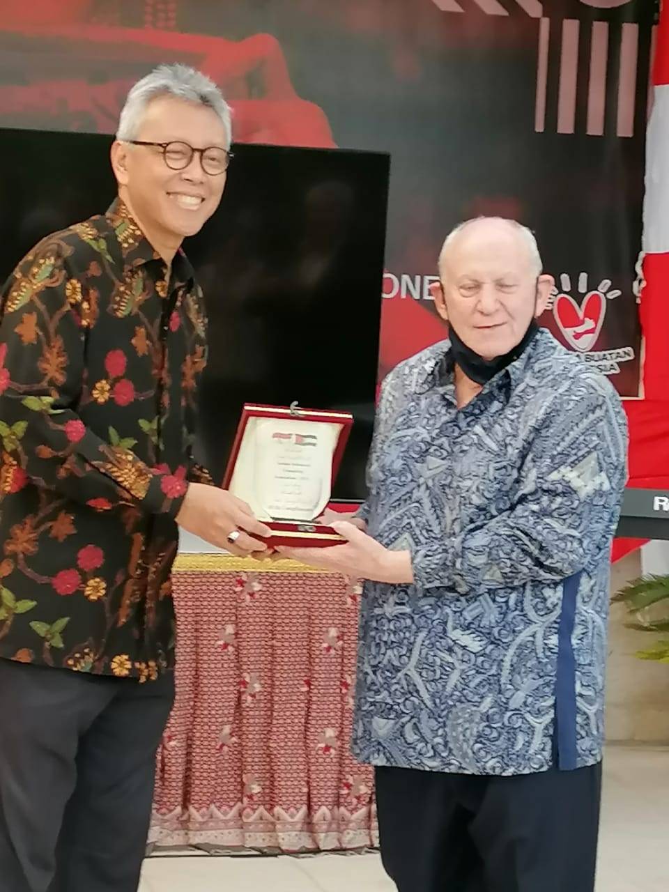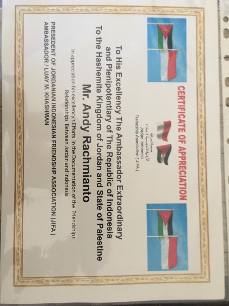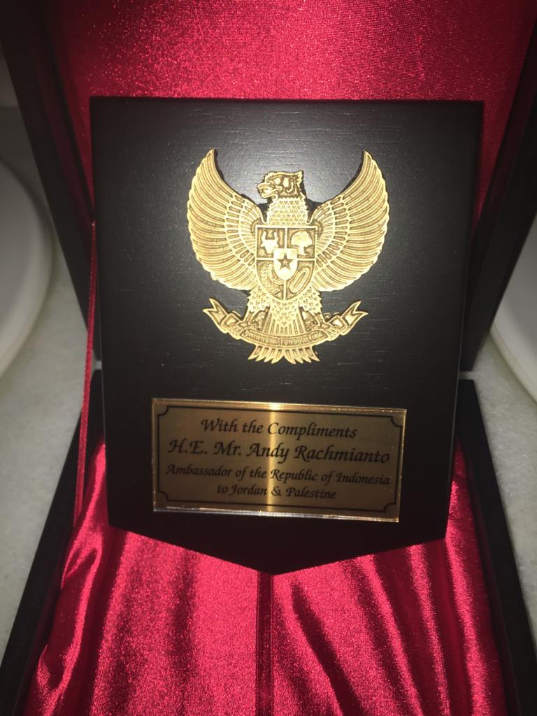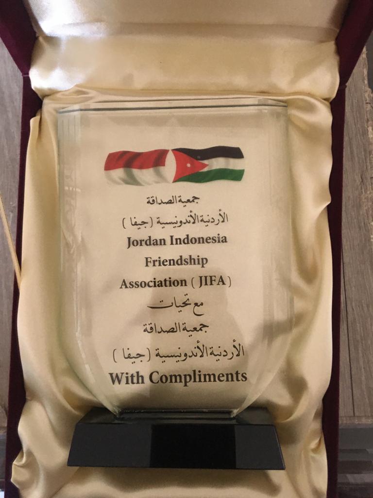 ..... كما قدم سعادة السفير لؤي الخشمان هدية باسمه ونيابة عن جمعية الصداقة الأردنية الإندونيسية هدية لسعادة السفير آندي رحميانتو وهي درع الجمعية وكذلك شهادة تقدير لسعادة السفير آندي تقديراً لجهوده في توثيق العلاقات بين الأردن واندونيسيا...