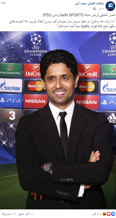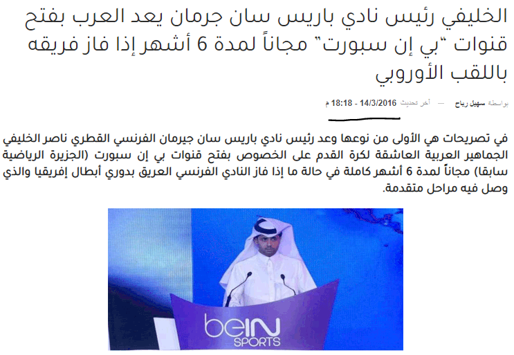 أن رئيس شبكة قنوات بي إن سبورت ورئيس نادي باريس سان جيرمان الفرنسي،