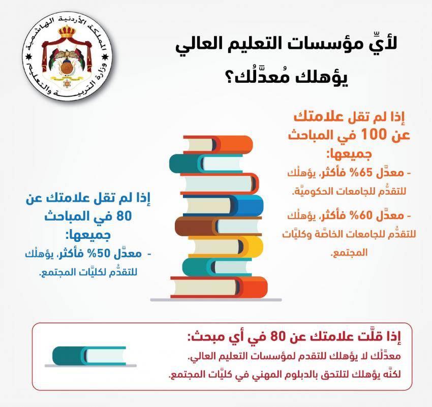 وأضافت الوزارة، في تغريدة لها عبر منصة تويتر، أن الطالب الذي يحصد معدل 65% فأكثر يستطيع الالتحاق بالجامعات الحكومية، فيما يتمكن الطالب الذي حصل على 60% التقدم الى الجامعات الخاصة وكليات المجتمع؛ وذلك شريطة حصوله على علامات لا تقل عن 100 في جميع المباحث.