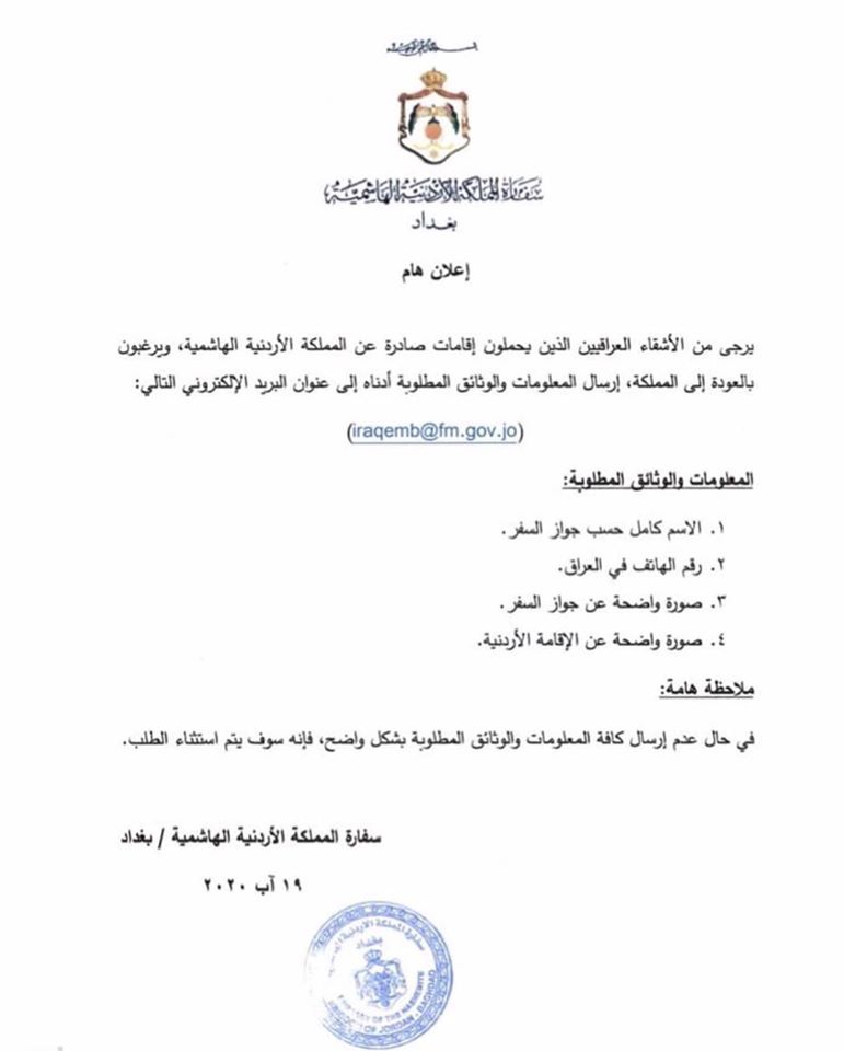 نيروز الإخبارية : دعت السفارة الأردنية في بغداد العراقيين الذين يحملون إقامات صادرة عن المملكه الأردنية الهاشمية ويرغبون بالعودة إلى المملكة، إرسال المعلومات والوثائق المطلوبه إلى العنوان البريدي الالكتروني iraqemb@fm.gov.jo.