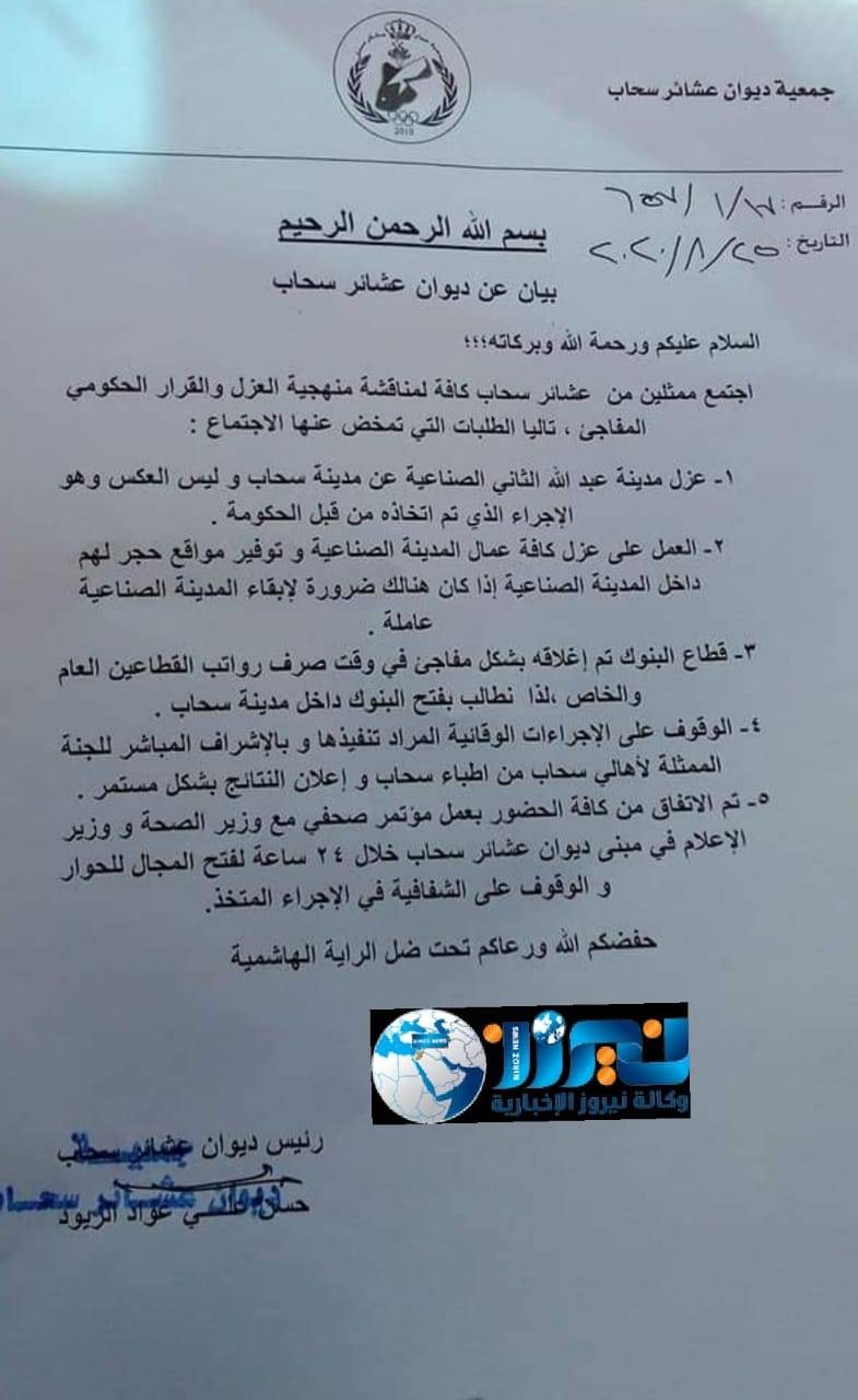 وبين البيان ، أنه تم الاتفاق مع كافة الحضور بعمل مؤتمر صحفي مع وزير الصحة ، ووزير الإعلام في مبنى ديوان عشائر سحاب خلال 24 ساعة ،لفتح المجال للحوار ، والوقوف على الشفافية في الإجراء المتخذ  .