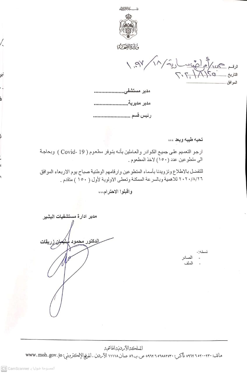 وطلب زريقات في تعميمه بتزويده باسماء المتطوعين وارقامهم الوطنية بالسرعة الممكنة على ان تعطى الاولوية لاول ١٥٠ متقدم.
