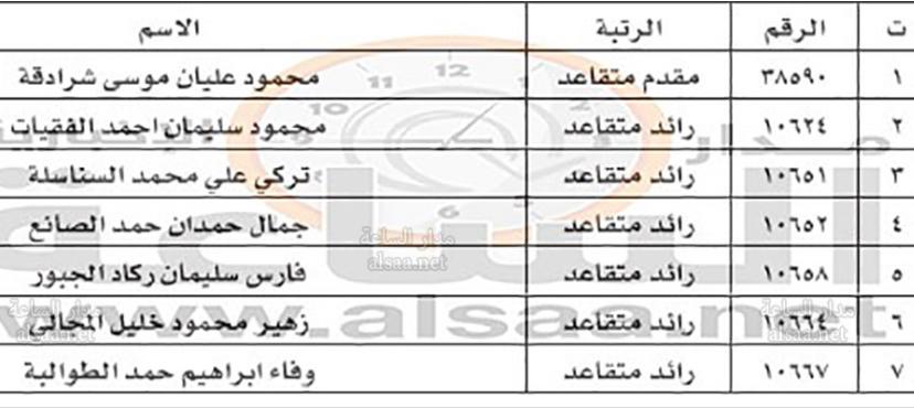 دعت مديرية الامن العام الضباط التالية اسماؤهم لمراجعة المديرية - ادارة الابنية، اعتبارا من صباح يوم الثلاثاء 1 / 9 / 2020 واحضار الوثائق لاستكمال الاجراءات تمهيدا لصرف قروض الاسكان الخاصة بهم عن شهر ايلول 2020.