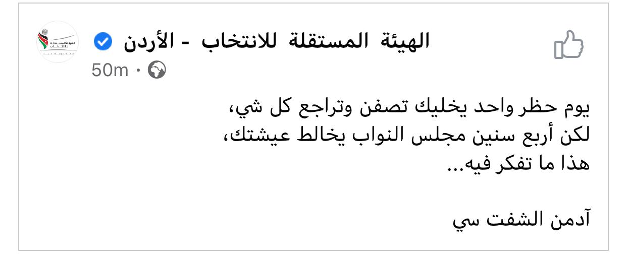 وجاء في المنشور الذي تمت إزالته بعد حوالي ساعة من نشره: " يوم حظر واحد بخليك تصفن وتراجع كل شي، لكن أربع سنين بمجلس النواب يخالط عيشتك، هذا ما تفكر فيه".