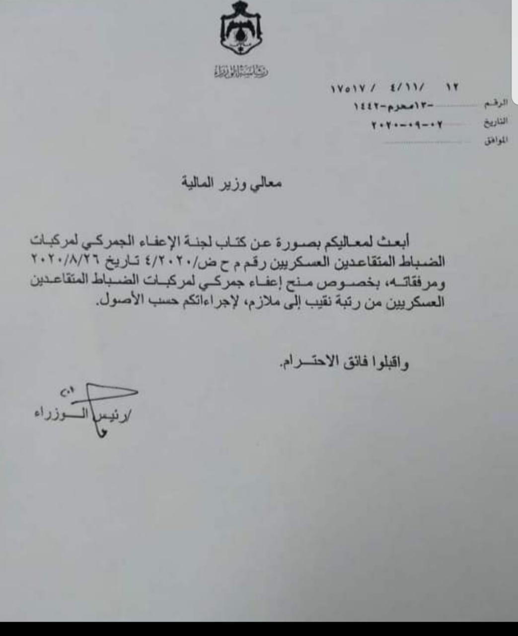 اصدر رئيس الوزراء الدكتور عمر الرزاز موجه لوزير المالية بشأن الإعفاء الجمركي لمركبات الضباط المتقاعدين العسكريين .