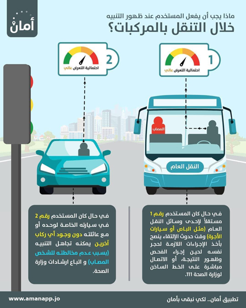 وبينت الشركة انه في حال وصل اشعار لشخص يستخدم وسائل النقل العامة مثل الباصات او سيارات الاجرة ، فينصح بأخذ الإجراءات اللازمة بإجراء الفحص وحجر نفسه لحين ظهور النتائج.