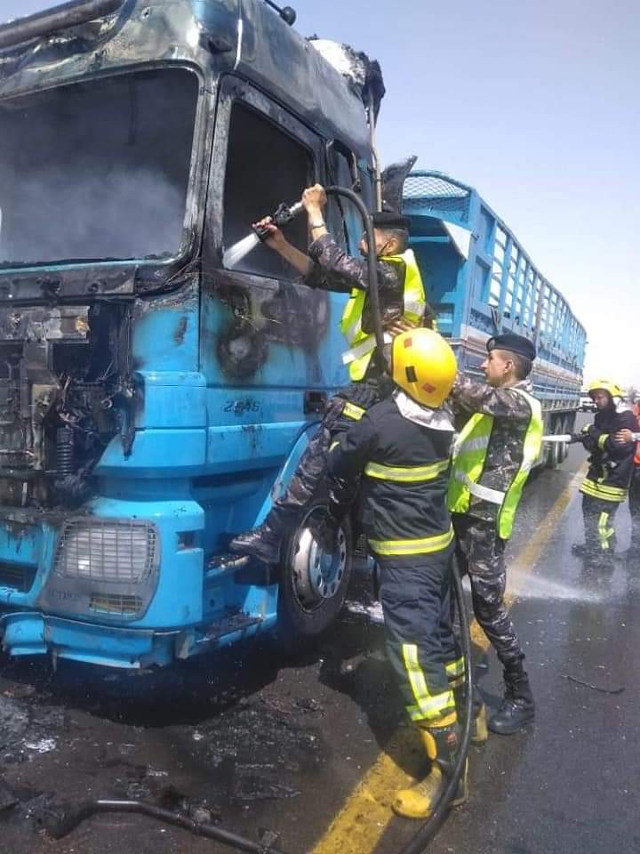 وتعاملت كوادر الدفاع المدني مع حادث اشتعال الشاحنة بالإطفاء .