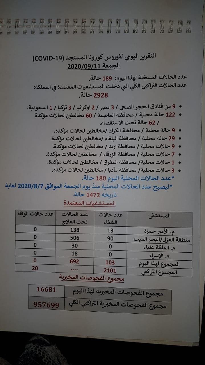 الأردن يسجل 180 إصابة محلية جديدة بالكورونا اليوم الجمعة