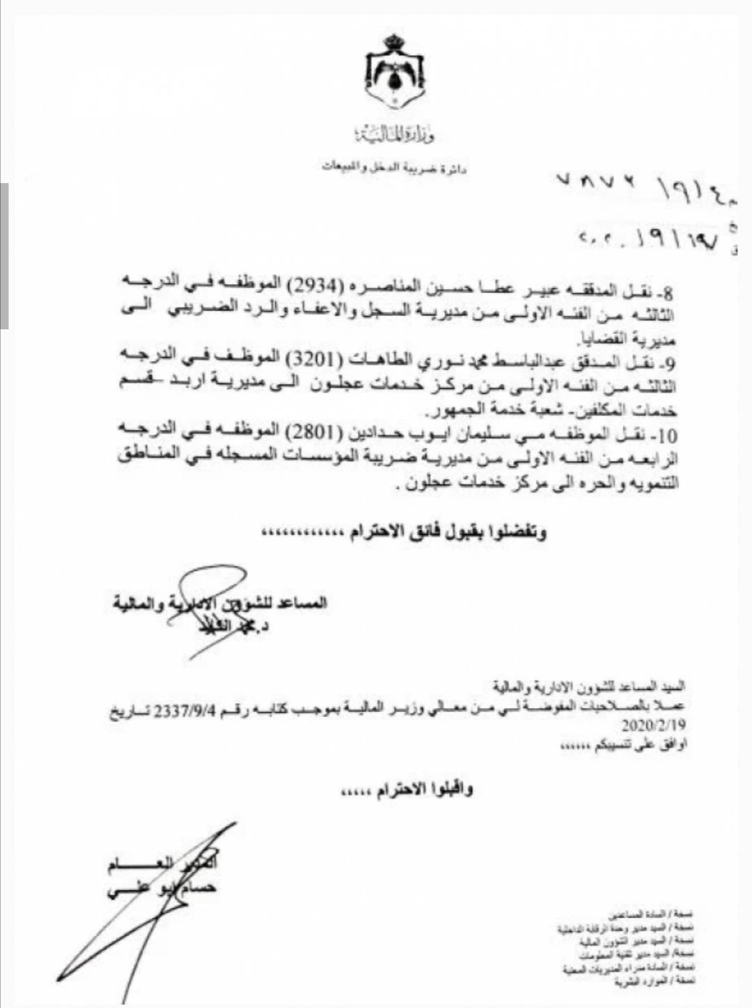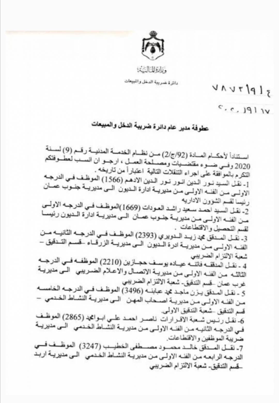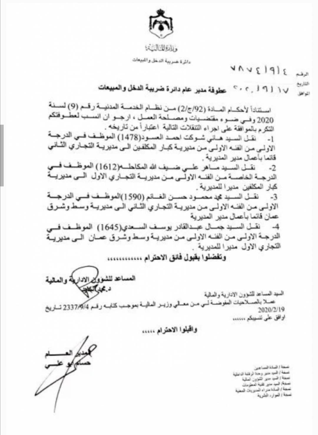 وافق مدير عام دائرة ضريبة الدخل والمبيعات حسام أبو علي اليوم الخميس على اجراء عدد من التنقلات في الدائرة.