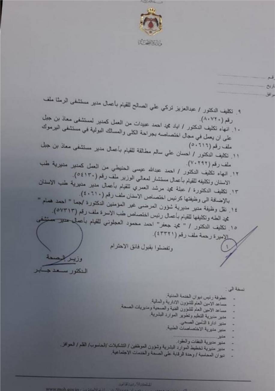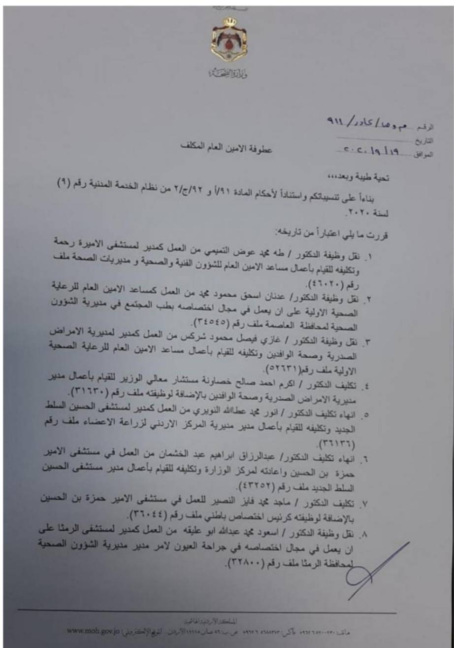واعفى جابر مسؤول ملف كورونا مساعد الامين العام لشؤون الرعاية الصحية عدنان اسحق من موقعه، كما انهى تكليف مدير مستشفى الامير حمزة عبدالرزاق الخشمان، ونقله مديرا لمستشفى السلط.