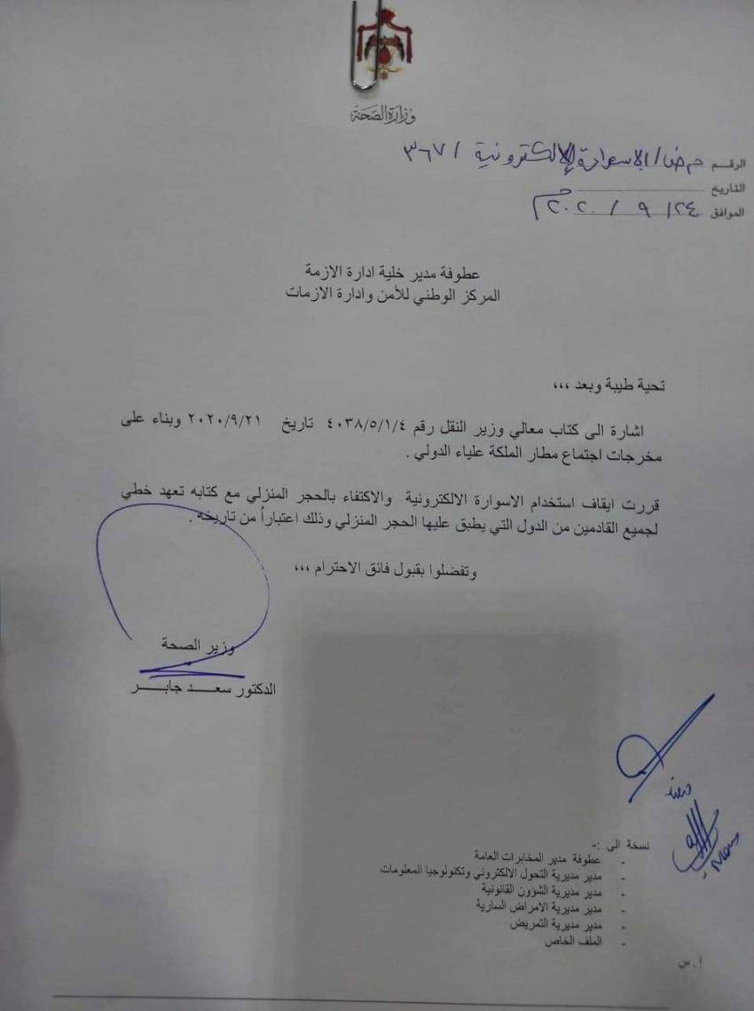 وكان قرر جابر مطبع ايلول الحالي إيقاف العمل بوضع الاسوارة الالكترونية بعد انتهاء الحجر المؤسسي لمن يحجر 14 يوما، مع الإبقاء على التعهد الخطي، والابقاء على استخدامها للذين انهوا الحجر المؤسسي لمدة 7 ايام.
