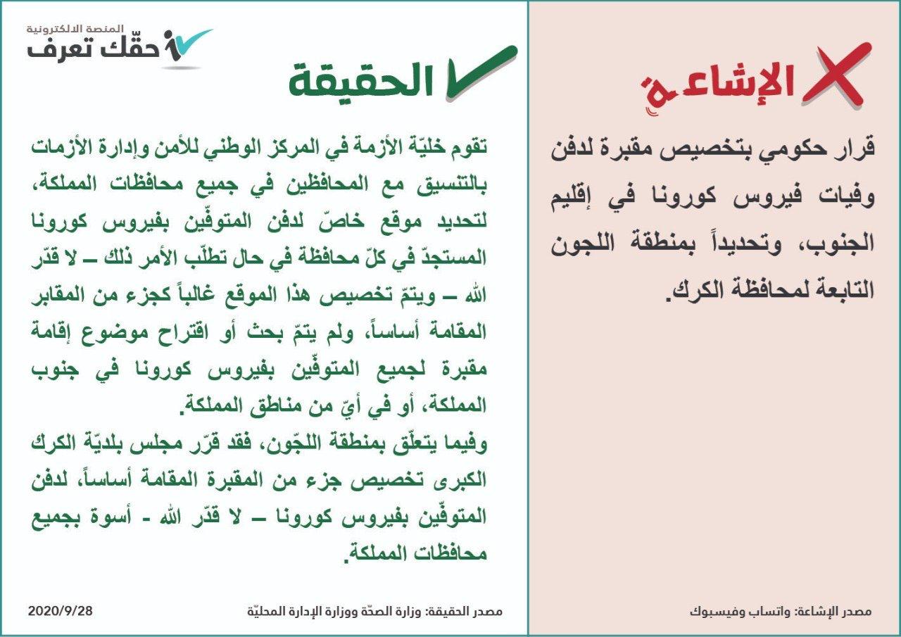 وأكدت الحكومة عبر منصة حقك تعرف " خلية الأزمة في المركز الوطني للأمن وإدارة الأزمات بالتنسيق مع المحافظين في جميع محافظات المملكة، لتحديد موقع خاص لدفن المتوفين بفيروس كورونا المستجد في كل محافظة في حال تطلب الأمر ذلك " .