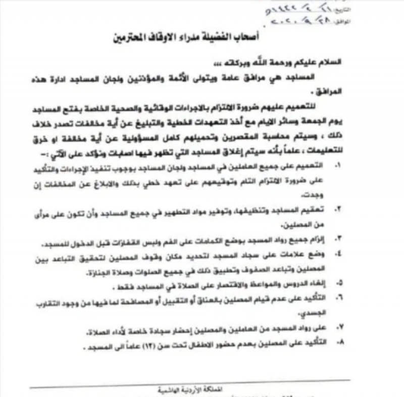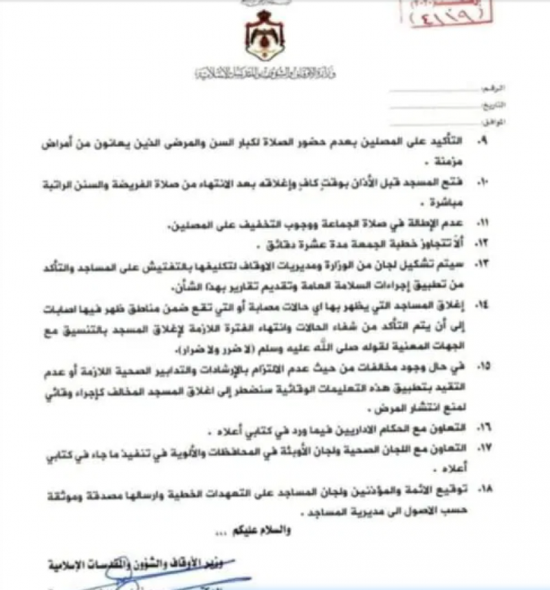 وبين أنه في حال وجود مخالفات، وعدم التزام بالإرشادات والتدابير الصحية اللازمة أو عدم التقيد بتطبيق هذه التعليمات الوقائية، ستضطر الوزارة إلى إغلاق المسجد المخالف كإجراء وقائي لمنع انتشار المرض إلى جانب ضرورة التعاون مع الحكام الإداريين.(بترا)