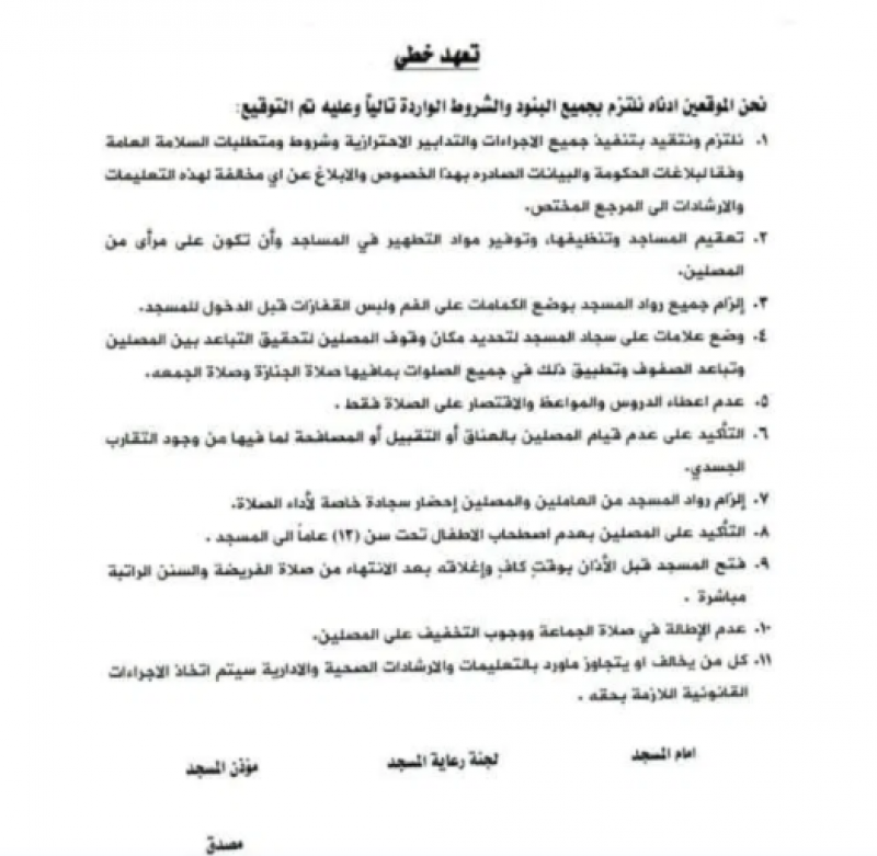 واشتمل التعميم على عدم حضور كبار السن ومن يعانون من أمراض مزمنة من المصلين وفتح المسجد قبل الأذان بوقت كاف وإغلاقه بعد الانتهاء من صلاة الفريضة والسنن الراتبة مباشرة إلى جانب عدم الإطالة في صلاة الجماعة ووجوب التخفيف على المصلين، وعدم تجاوز خطبة الجمعة عن الـ 10 دقائق.