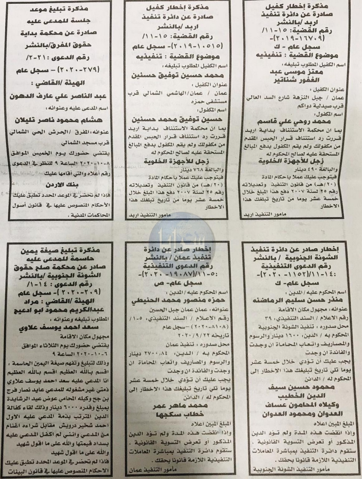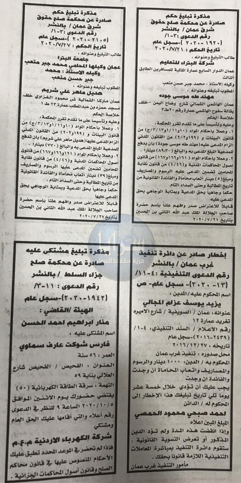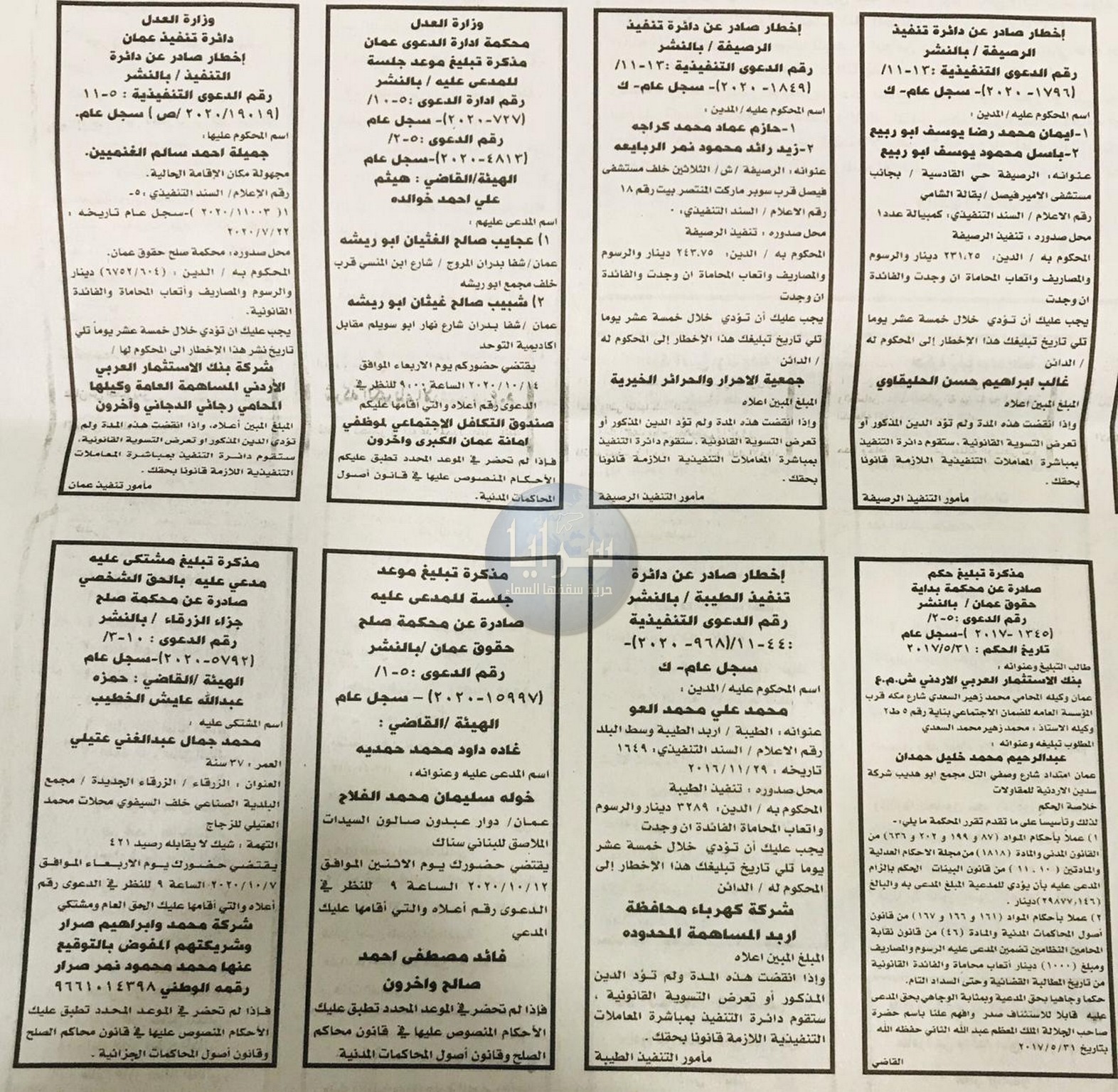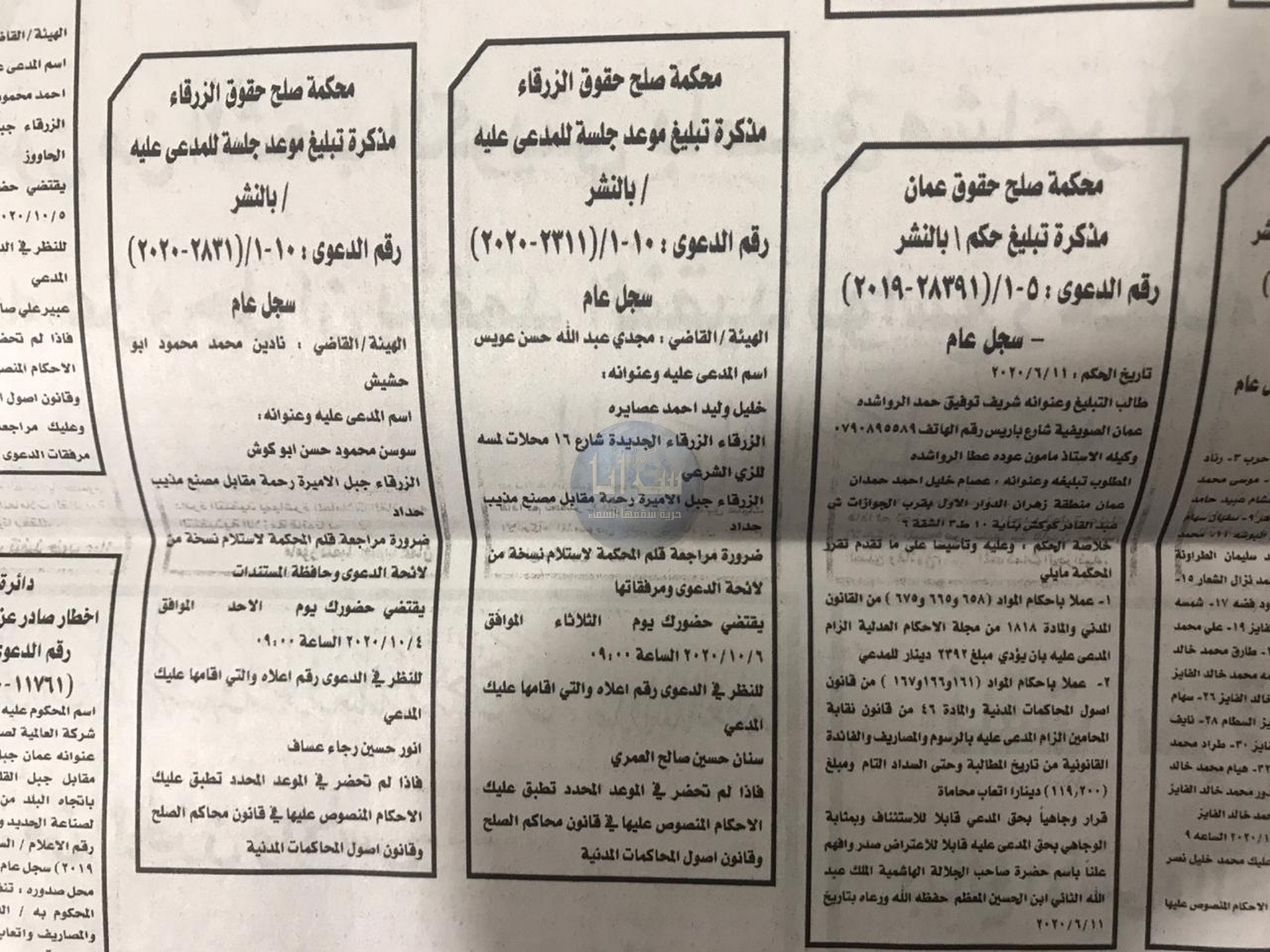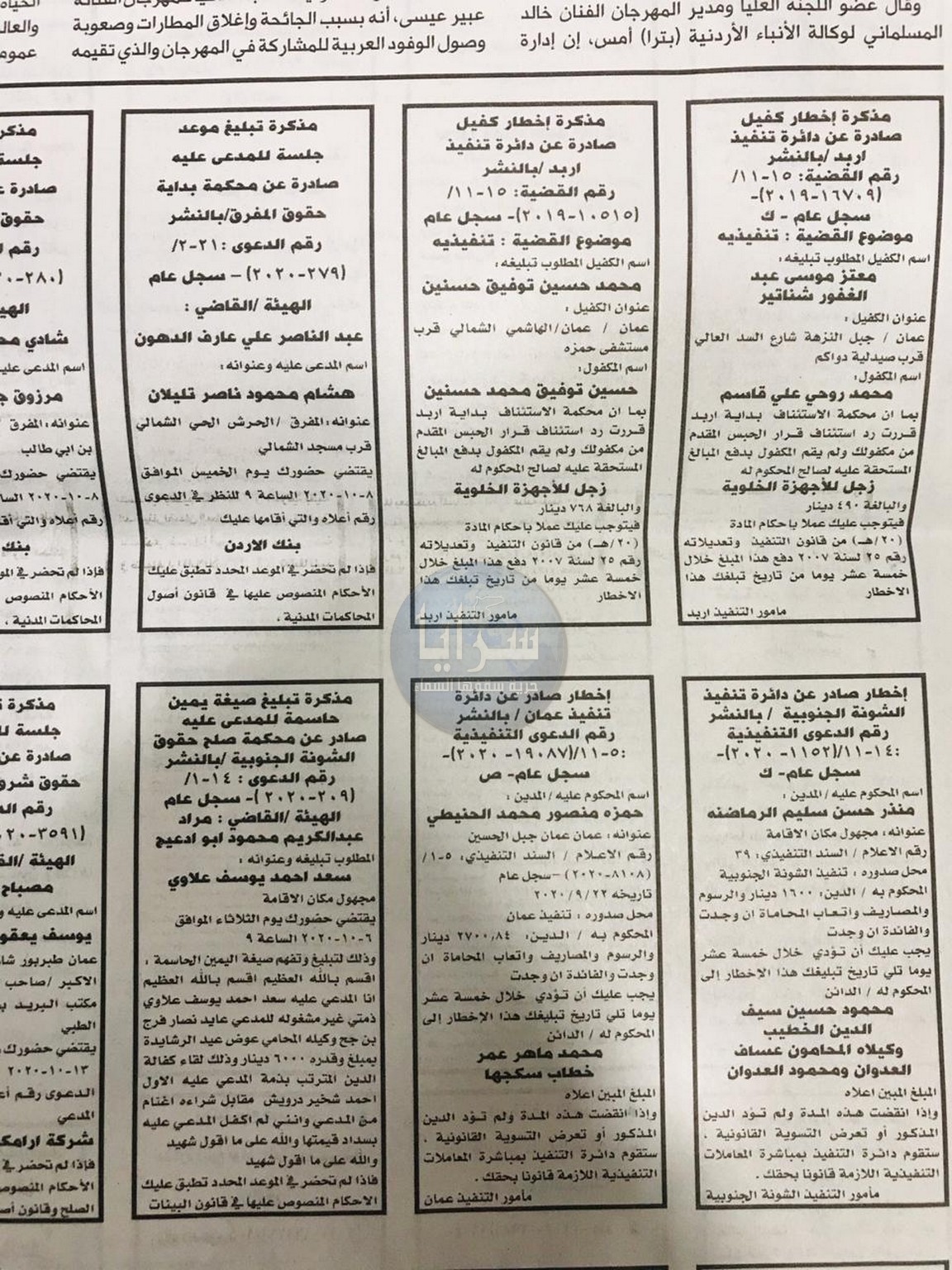أصدرت أغلب المحاكم الاردنية بلاغات لأردنيين لحضور جلسات محكمة واعلانات لبيع عقارات بالمزاد العلني.