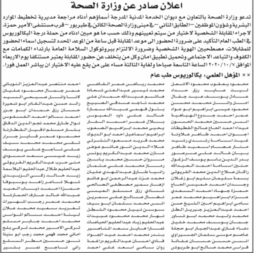 دعت وزارة الصحة، المرشحين للتعيين المدرجة أسماؤهم مراجعة مديرية تخطيط الموارد البشرية وشؤون الموظفين في مبنى الوزارة.