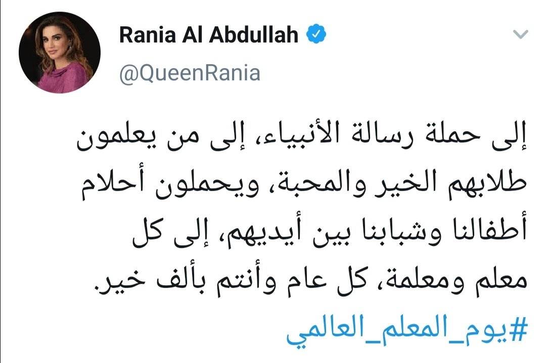 وقالت الملكة" إلى حملة رسالة الأنبياء، إلى من يعلمون طلابهم الخير والمحبة، ويحملون أحلام أطفالنا وشبابنا بين أيديهم، إلى كل معلم ومعلمة، كل عام وأنتم بألف خير".