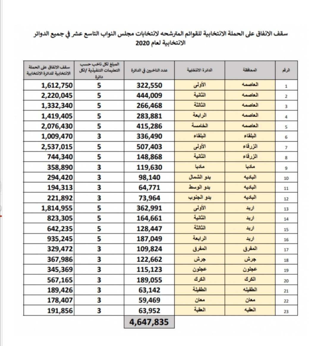 ووفقا لأحكام المادة (16)، الفقرة (ب) من التعليمات التنفيذية الخاصة بقواعد حملات الدعاية الانتخابية وتعديلاتها رقم (7) لسنة 2016، والتي حددت السقف المالي للانفاق على الحملة الانتخابية وفقا لمعايير خاصة تتعلق بحجم الدائرة الانتخابية وعدد الناخبين وكلفة المعيشة وبحيث تلتزم القوائم المترشحة بالسقف المالي والمحدد في الدوائر الانتخابية لعمان واربد والزرقاء بـ (5) خمسة دنانير للناخب الواحد مضروبا في مجموع الناخبين في تلك الدائرة، و(3) ثلاثة دنانير للناخب الواحد مضروبا في مجموع الناخبين في باقي الدوائر.