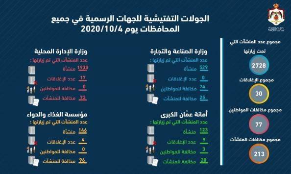 وقالت الحكومة، إن أبرز مخرجات جولات الرقابة ليوم الأحد، تمثلت بزيارة 2728 منشأة، وإغلاق ٣٠ منها، إضافة إلى-مخالفة ٧٧ مواطنا، و ٢١٣ منشأة.