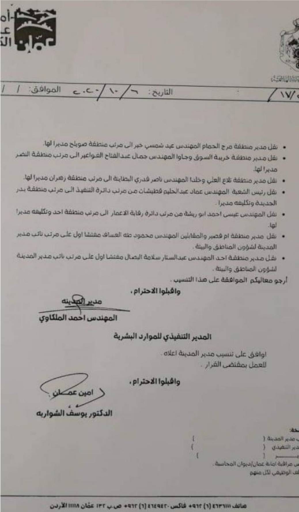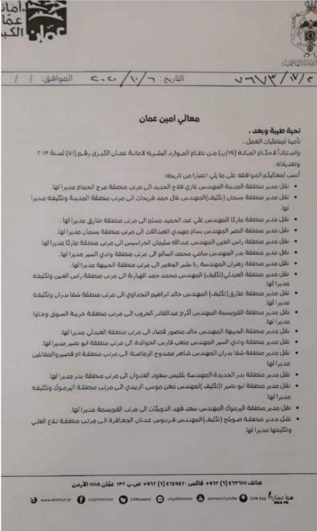 رر أمين عمان الدكتور يوسف الشواربة اجراء تنقلات واسعة بين مديري المناطق في العاصمة.
