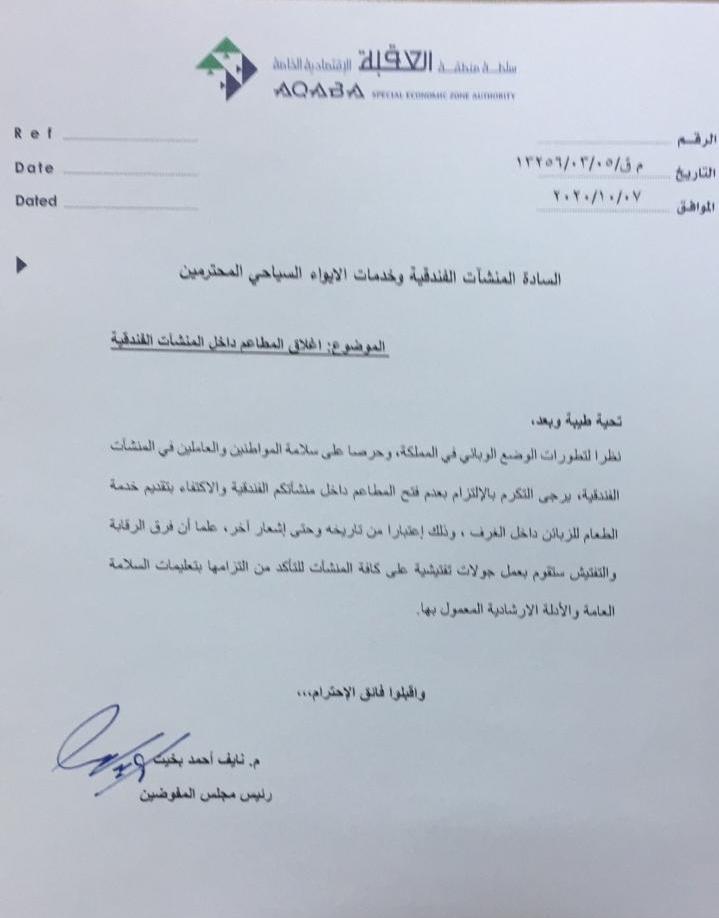 وبينت السلطة في كتابها الذي حمل توقيع رئيس السلطة نايف بخيت انه ونظرا لتطورات الوضع الوبائي في المملكة وحرصا على سلامة المواطنون والعاملين في المنشآت السياحية والفندقية يقتصر تقديم الطعام للزبائن داخل الغرف وإغلاق المطاعم داخل المنشآت الفندقية حتى إشعار آخر.
