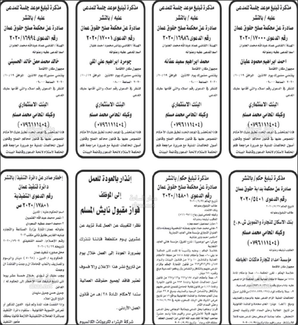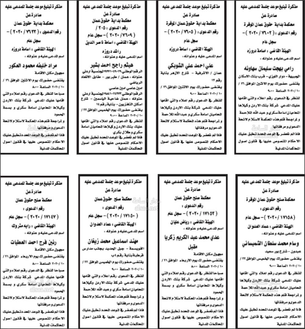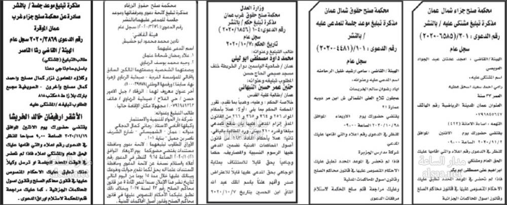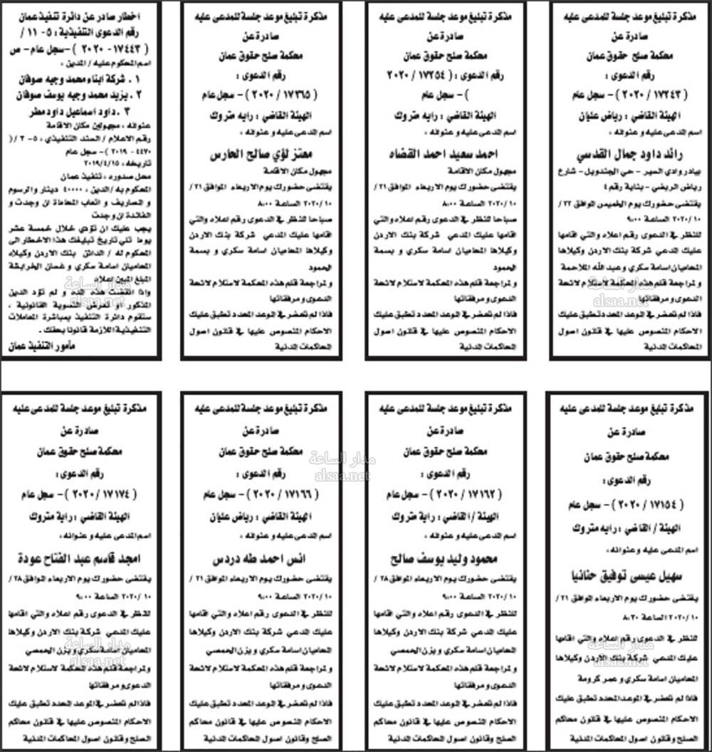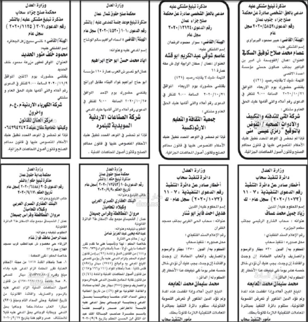أعلنت محاكم الخميس 15/ 10 / 2020 عن مذكرات تبليغ مواعيد جلسات المحاكمة للمشتكى عليهم المذكورين تاليا.